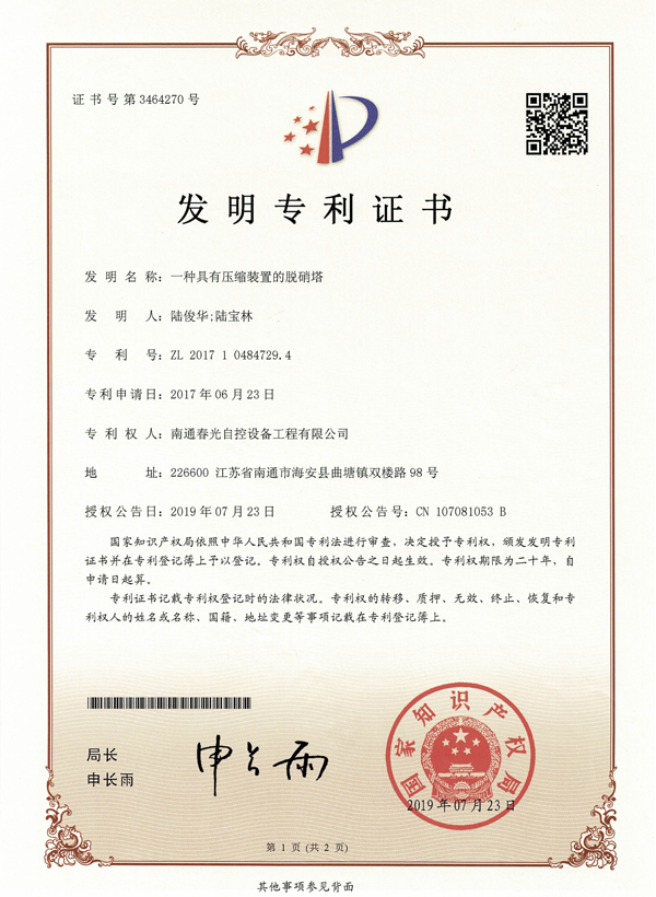 安裝有囊式壓縮裝置的脫銷(xiāo)塔專(zhuān)利證書(shū)